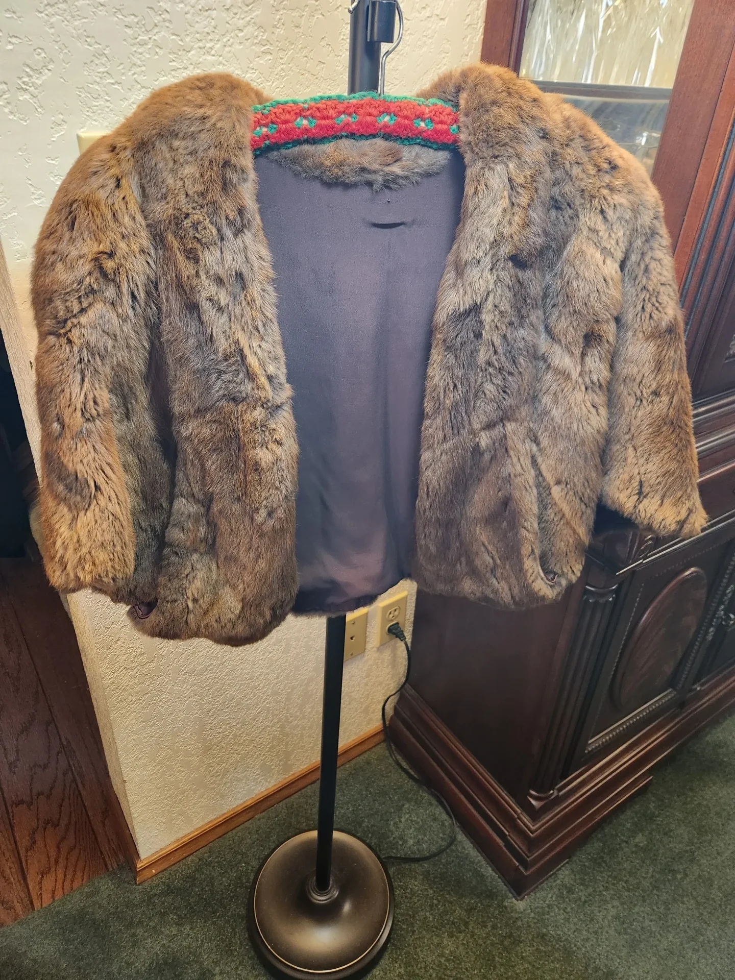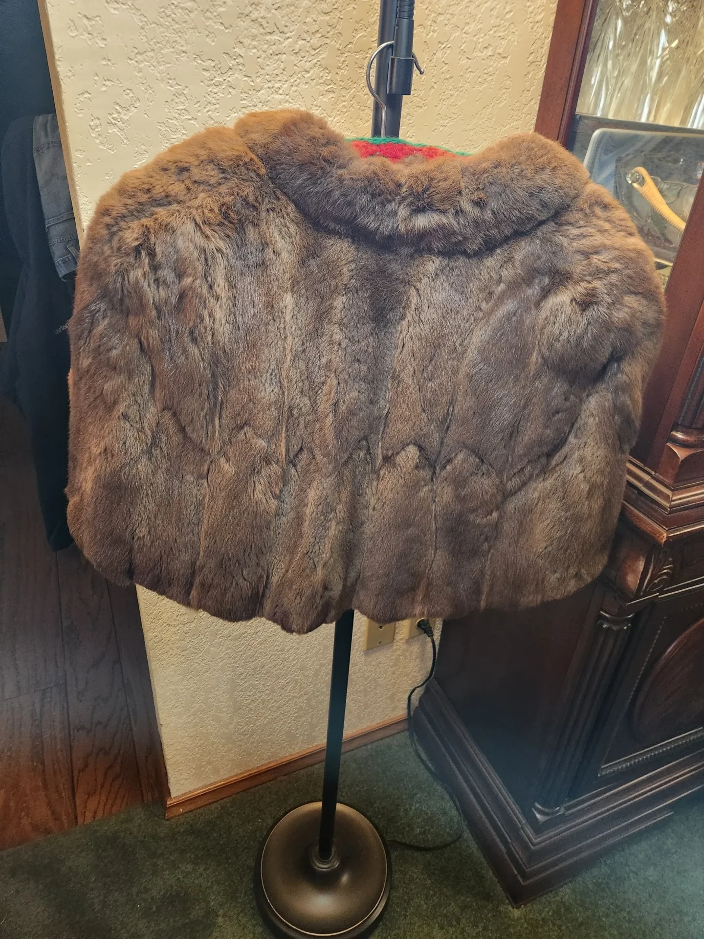 Unique vintage fur that has concealed pockets in the extended collar roll that goes down to the front bottom hem of fur stole. This fur sports beautiful soft medium to light brown tones. If you worry about have the fur drop down off of your shoulders, this fur has an arm harness built into it to slide your arms through, which prevents your fur from falling off of your shoulders. I love this extra special feature to this fur.