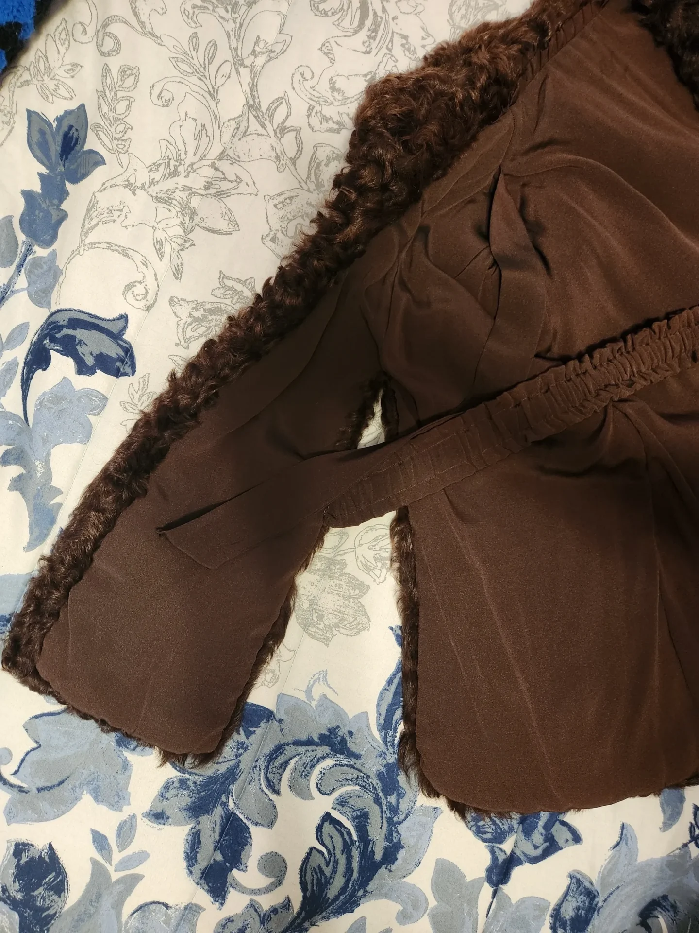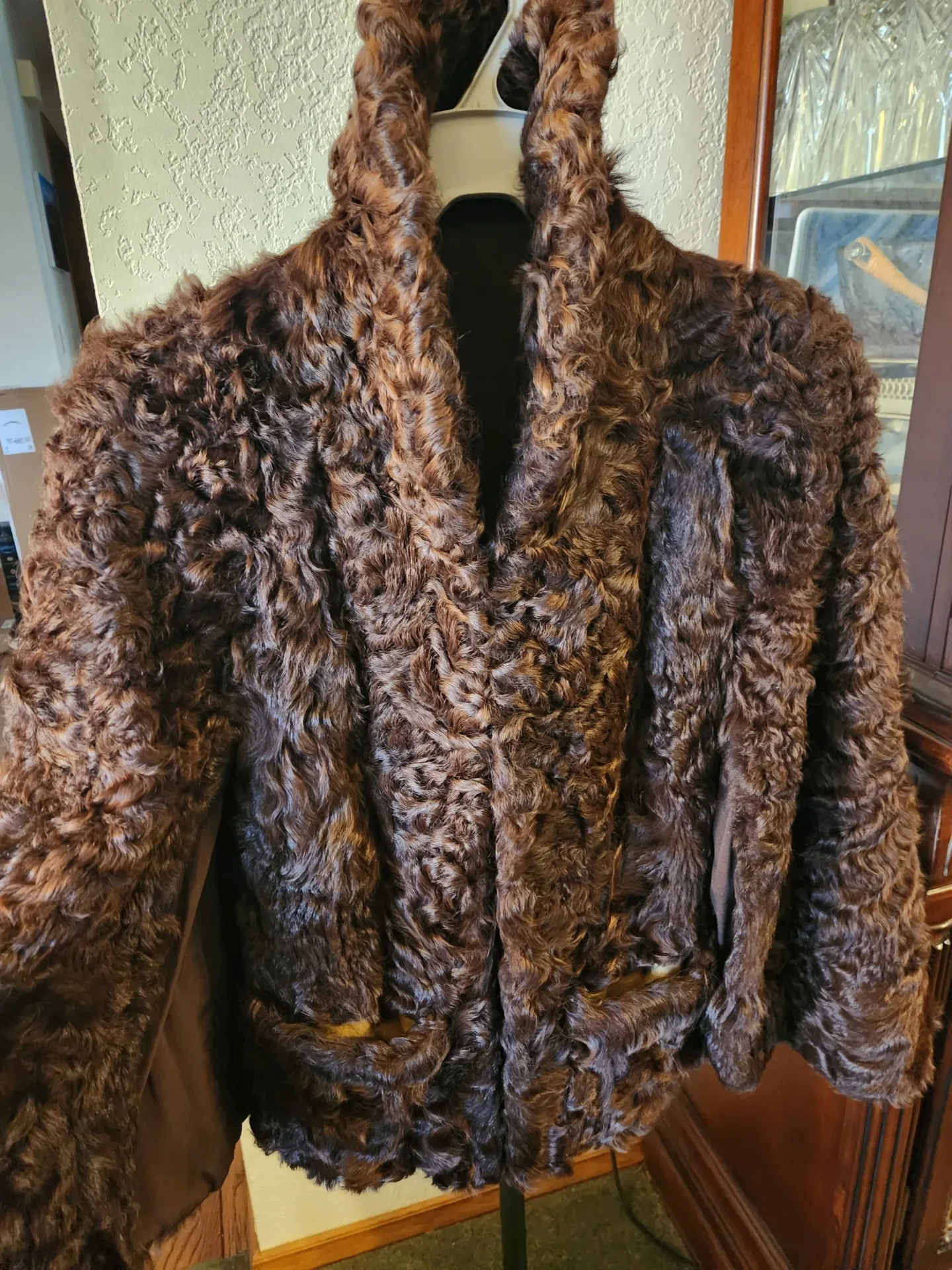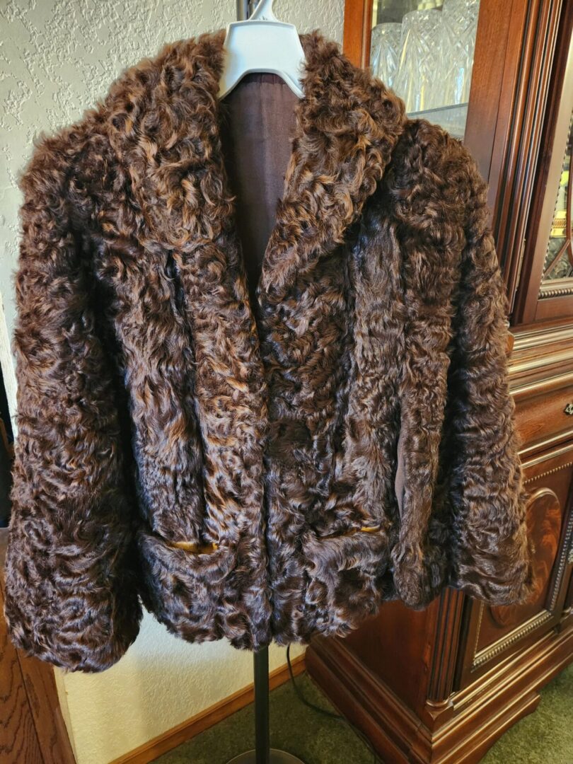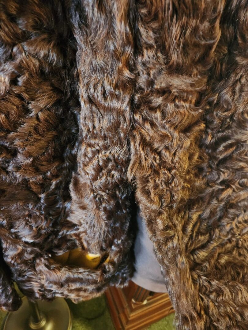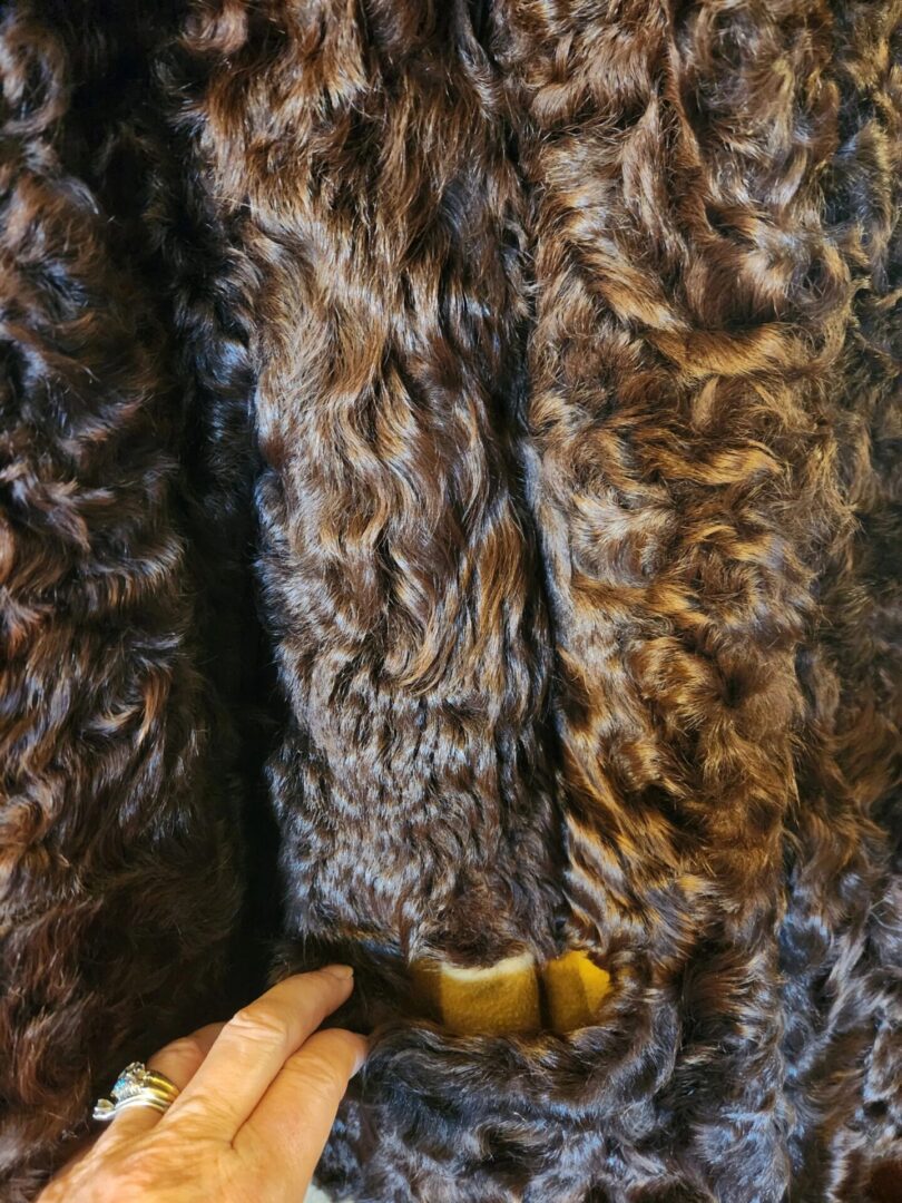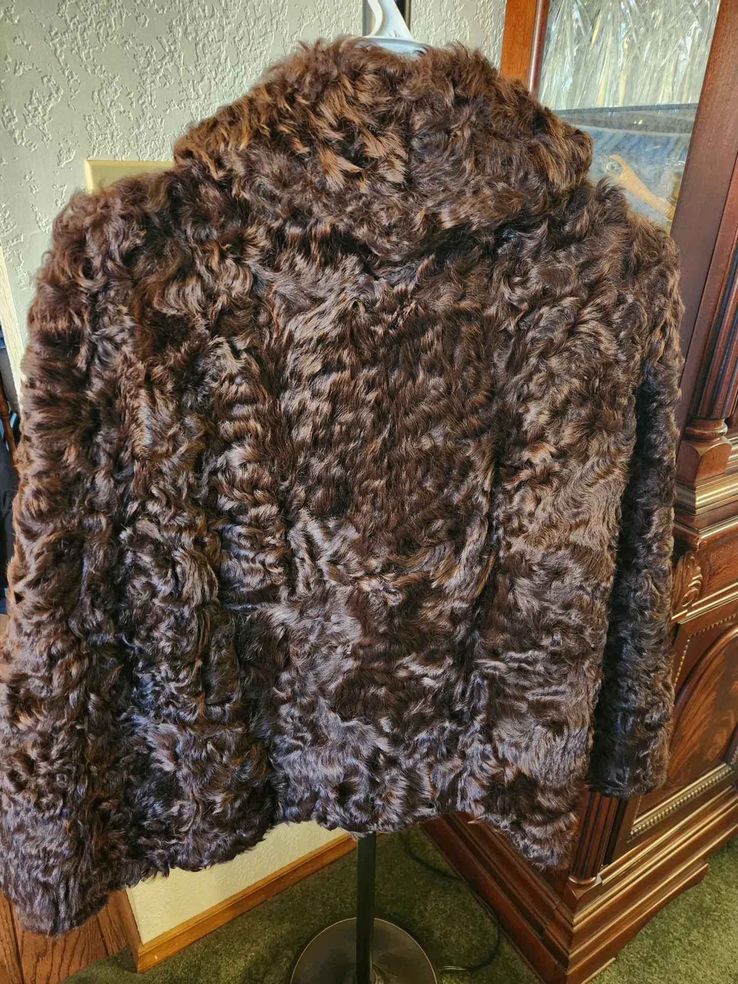 This vintage dark brown Persian Lamb cape has 3 hook and eye closures, which allows you to unroll the collar to give added warmth and coverage to your neck. With the curly fur it gives an added texture to your attire. The cape has an interior elastic waist strap, and it also has armhole straps to prevent your cape from falling off of your shoulders. It is fully lined in a matching dark brown tone.